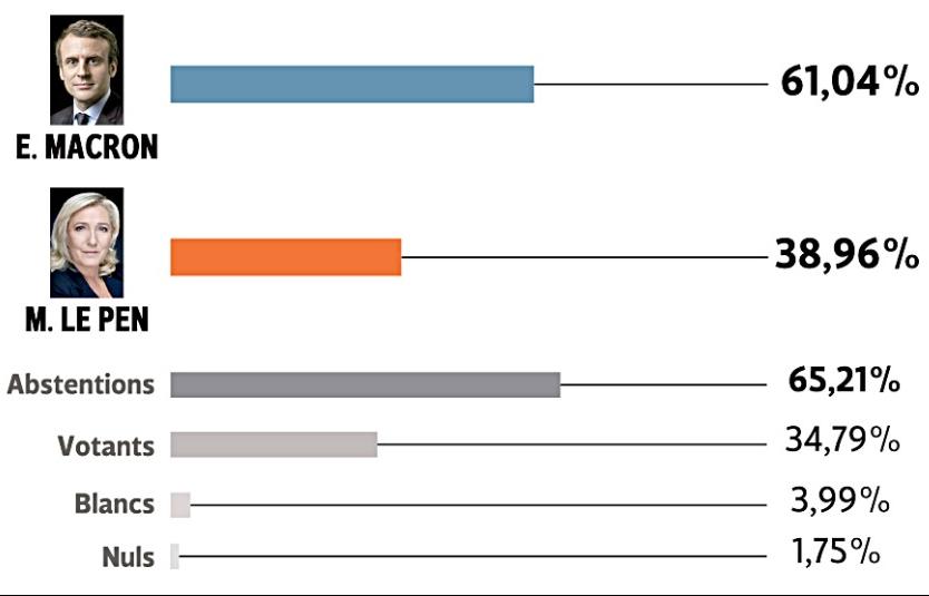 - Le président sortant remporte pour la seconde fois l’élection présidentielle sur le Caillou avec 61,04 % des suffrages contre 38,96 % pour sa rivale, Marine Le Pen. Une victoire sur fond d’abstention record, puisque 65,21 % des électeurs qui ne sont pas déplacés.Carton plein : le président sortant Emmanuel Macron arrive en tête des trente-trois communes calédoniennes au terme de ce second tour de l’élection présidentielle, réunissant 61,04 % des suffrages devant Marine Le Pen et ses 38,96 %. À lire également : Notre édition spécialeIl vous reste 89% de l'article à découvrir.Cet article est réservé aux abonnés.