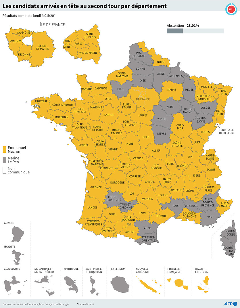 - Sur les treize régions métropolitaines, Emmanuel Macron en rafle dix. Marine Le Pen s'impose dans les campagnes.Île-de-France Engrangeant 2,2 millions de voix de plus que sa concurrente, Emmanuel Macron (73,02 %) s'impose largement face à Marine Le Pen (26,98 %) en Île-de-France. Il est fortement plébiscité à Paris (85,10 %) et dans les Hauts-de-Seine (80,39 %). Les départements du Val-de-MarneIl vous reste 95% de l'article à découvrir.Cet article est réservé aux abonnés.