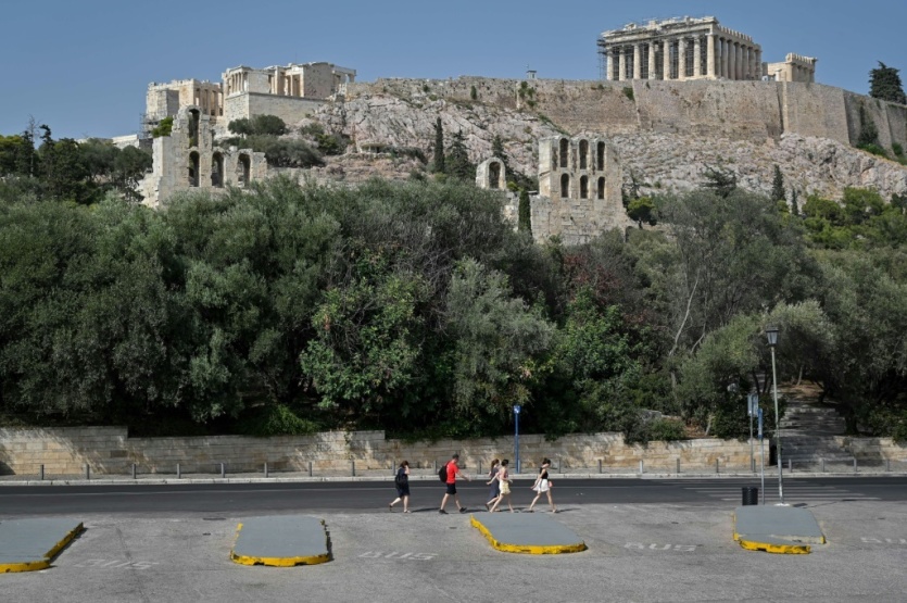 Des touristes passent sur le parking vide de l'Acropole d'Athènes, fermée pour cause de canicule, le 2 août 2021 LOUISA GOULIAMAKI [AFP]