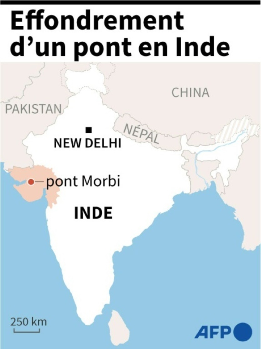 Les autorités ont évalué à 500 le nombre des personnes qui, notamment, célébraient les fêtes de Diwali sur ce pont piétonnier à Morbi, à environ 200 kilomètres à l'ouest d'Ahmedabad, la principale ville de l'Etat du Gujarat, lorsque les câbles le soutenant ont cédé peu après la tombée de la nuit.