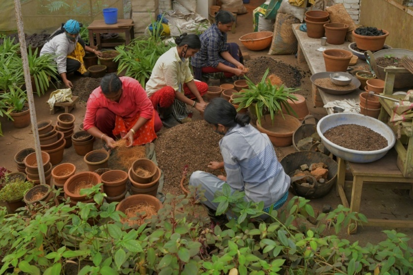 Vêtements bigarrés, cheveux noués sous des foulards, toutes chaussées de grandes bottes en caoutchouc pour se protéger des morsures de serpents comme le redoutable king cobra, et des sangsues, les jardinières s'affairent dans la forêt, sous les serres et les pépinières, rempotent ici, pollinisent là. D'autres tamisent le compost, collectent des graines, pulvérisent des pesticides naturels malodorants, à base d'urine de bovin.
