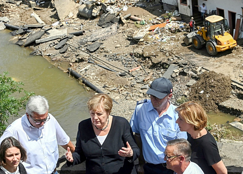 La chancelière allemande Angela Merkel visite le village de Schuld près de Bad Neuenahr-Ahrweiler, en Allemagne, le 18 juillet 2021 Christof STACHE [POOL/AFP]MERCI DE VOUS IDENTIFIER