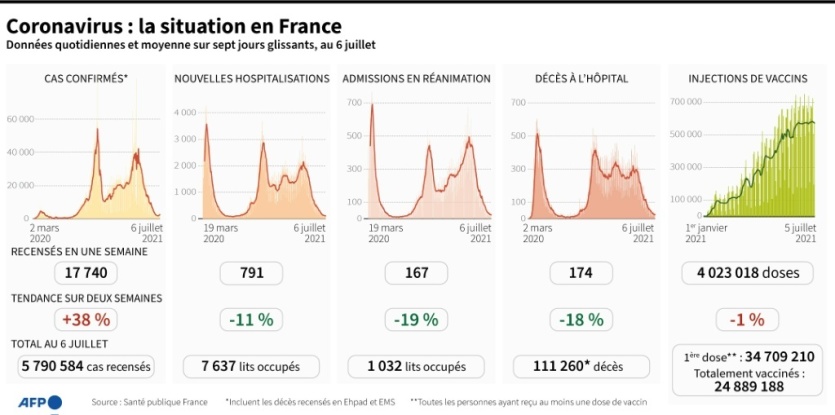 Au total, 52,1% de la population, soit 35,1 millions de personnes, ont reçu au moins une injection, et 38,3% (25,8 millions) sont complètement vaccinés, a indiqué mercredi la Direction générale de la santé. L'objectif des autorités est de vacciner 40 millions de Français en première injection d'ici fin août et de parvenir à 35 millions de schémas vaccinaux complets, soit les deux tiers des adultes.