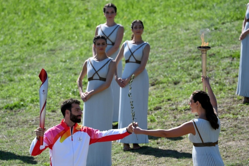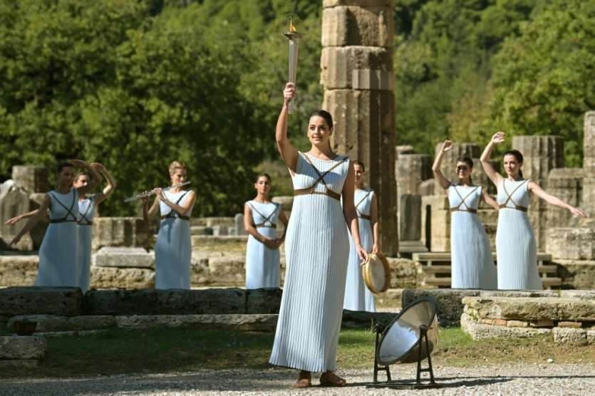La flamme a été allumée peu après 12H00 locales (09H00 GMT) par les rayons d'un soleil radieux sur les ruines du temple antique d'Hera à Olympie, berceau des Jeux de l'Antiquité, en l'absence de public à cause de la pandémie de Covid-19.