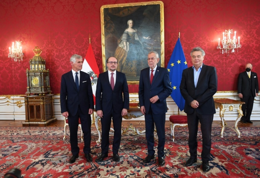 (g-d) Le nouveau ministre autrichien des Affaires étrangères Michael Linhart, le nouveau chancelier autrichien Alexander Schallenberg, le président autrichien Alexander Van der Bellen et le vice-chancelier autrichien, leader des Verts, le 11 octobre 2021 au palais Hofburg, à Vienne JOE KLAMAR [AFP]