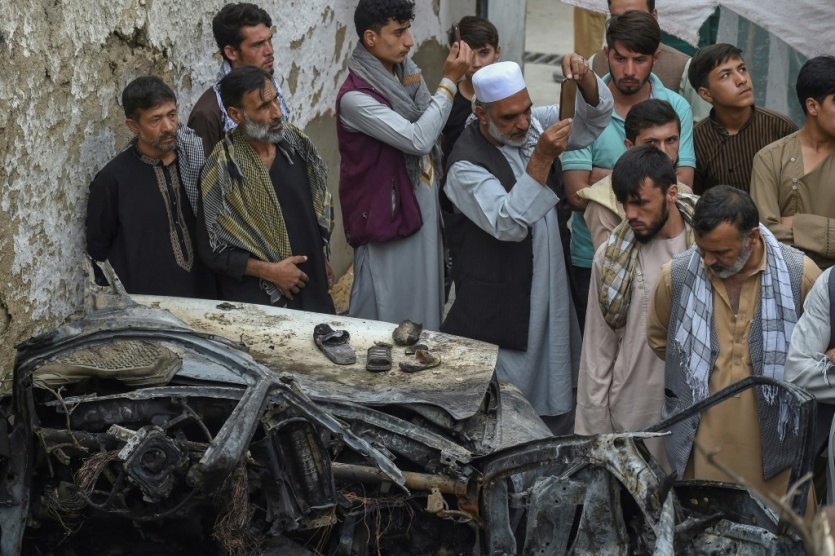 Des proches des victimes d'une frappe américaine sur une voiture - une bavure "tragique" - autour de la carcasse du véhicule, le 30 août 2021 à Kaboul WAKIL KOHSAR [AFP]MERCI DE VOUS IDENTIFIER