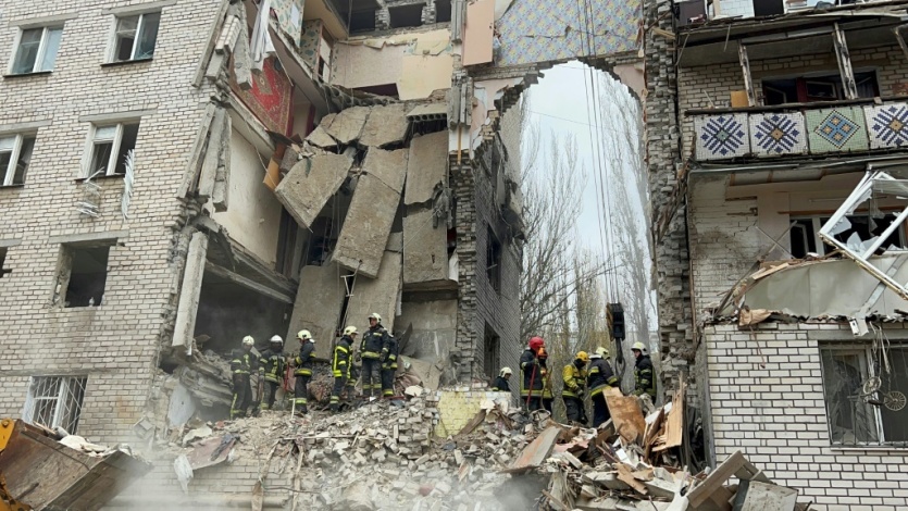Des pompiers et secouristes ukrainiens dans les décombres d'un immeuble touché par une frappe, le 11 novembre 2022 à Mykolaïv, en Ukraine Yelyzaveta Krotyk [AFP]MERCI DE VOUS IDENTIFIER