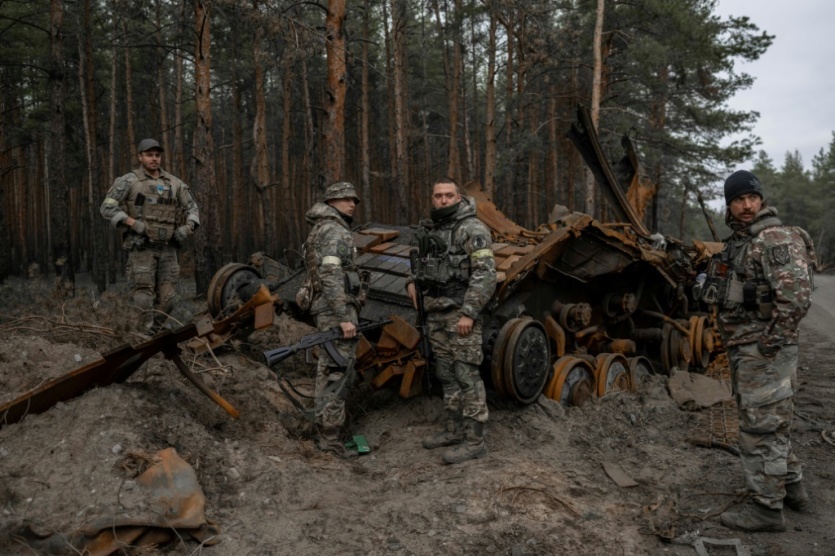 Des soldats ukrainiens inspectent un blindé russe détruit, quelque part dans l'est de l'Ukraine, le 10 novembre 2022 BULENT KILIC [AFP]