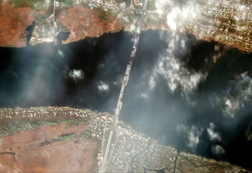 Photo satellite du pont Antonivskyï sur le Dniepr à Kherson, dynamité par les forces russes le 11 novembre 2022 Handout [Satellite image ©2022 Maxar Technologies/AFP]