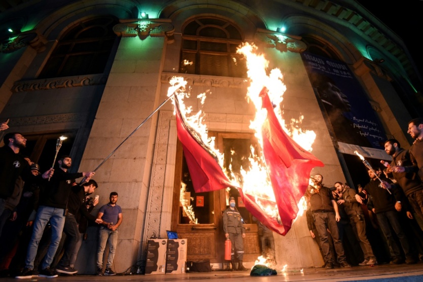Des hommes mettent feu à un drapeau turc et un drapeau de l'Azerbaïdjan à Erevan, en Arménie, le 23 avril 2021 Karen MINASYAN [AFP]MERCI DE VOUS IDENTIFIER