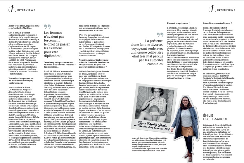 La Une du magazine L Calédonie de mai 2024. Photo Cissia SchippersEn ce moment, je travaille aussi avec mes collègues de l'IANCP (Institut d'archéologie de la Nouvelle-Calédonie et du Pacifique) et de la province Nord sur un projet d'exposition qui mettra la lumière à la fois sur Elizabeth Shutler et son rôle lors de l'expédition Gifford-Shutlers, et sur les " travailleurs kanak " longtemps restés anonymes et qui collaborèrent de près avec Elizabeth puisque…elle était la seule des Américains à parler français !