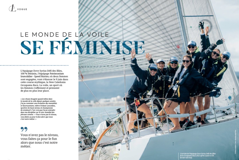 - Frédérique de Jode / L Calédonie magazine | Crée le 15.09.2024 à 14h00 | Mis à jour le 15.09.2024 à 14h00ImprimerMoment de partage pour l’équipage Dove Syrius Défi des filles, avec de gauche à droite, Christine, Sophie, Laura, Alizée et Sandrine à la barre. Photo Kreatica / Cocogé 2022L’équipage Dove Syrius Défi des filles, 100 % féminin, et l’équipage Patrimonium Immobilier – Speed Marine, où deux femmes sont engagées, devaient s’élancer le 9 juin dans la New Caledonia Groupama Race. Si la course a été reportée à 2025 en raison des émeutes, le sujet traité par notre partenaire L Calédonie magazine n’en demeure pas moins d’actualité. La voile, un sport où les femmes s’affirment et trouvent de plus en plus leur place.