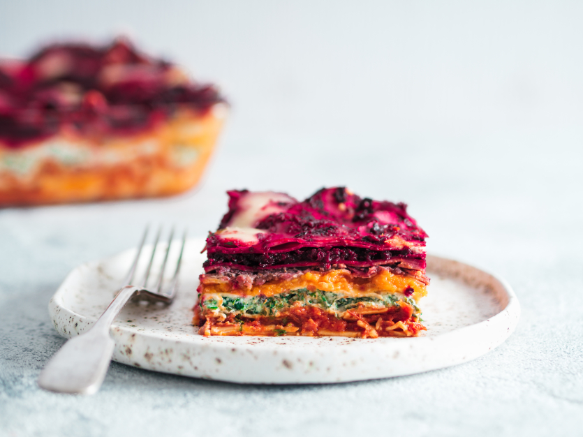 8. Dans un moule à gratin, versez une légère couche de béchamel, couvrez de plaques à lasagnes. Ajoutez la préparation à la tomate, recouvrez de mozzarella râpée puis couvrez à nouveau de plaques à lasagnes. Ajoutez une fine couche de béchamel, la préparation aux épinards, la ricotta. Ajoutez à nouveau les plaques de lasagnes puis répétez avec les carottes et les betteraves. Terminez par une couche de plaques à lasagnes, versez le reste de la béchamel puis la mozzarella. Enfournez pour 25 minutes.