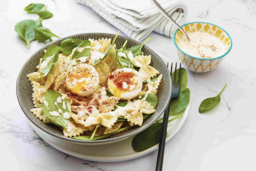 3. Versez la crème sur les pâtes, mélangez, puis dressez les pâtes dans une assiette creuse, ajoutez quelques jeunes pousses d’épinard et les œufs mollets.