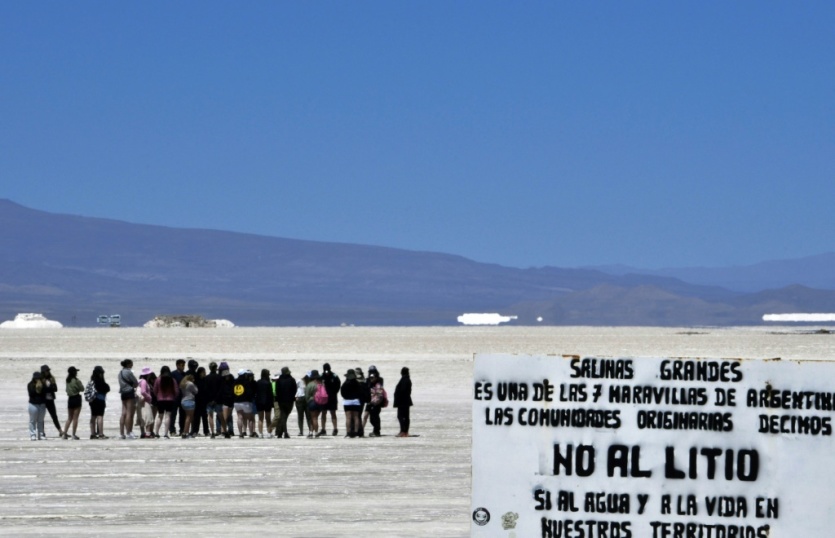 Des touristes visitent le désert de sel de Salinas Grandes près d'un panneau anti-lithium dans la province septentrionale de Jujuy, en Argentine, le 18 octobre 2022 AIZAR RALDES [AFP]