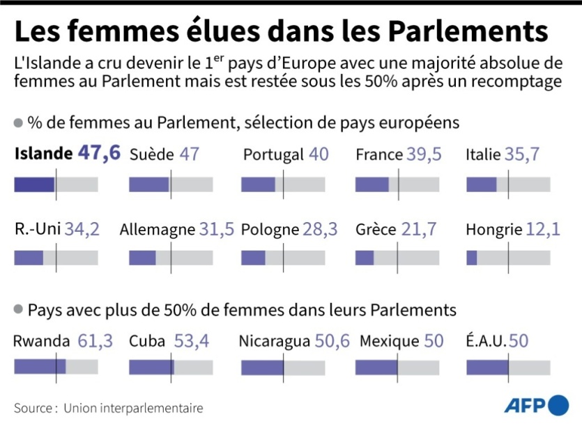 Sur les 63 sièges de l'Althingi, le millénaire Parlement islandais, 30 seront occupés par des femmes, contre 33 avant ce recomptage.