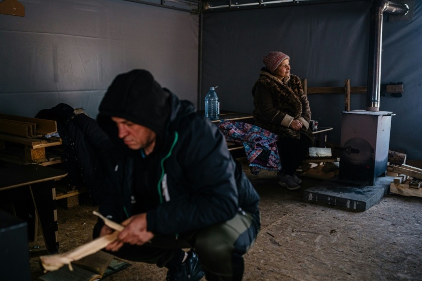 A Borodianka, au nord-ouest de Kiev recouverte de neige et de verglas, de grandes tentes équipées de poêles à bois ont été installées pour permettre à la population de se réchauffer ou de cuisiner.