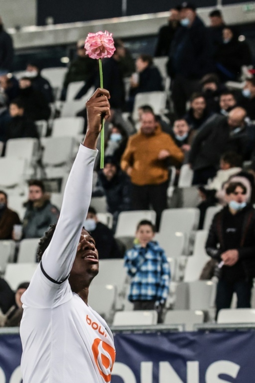 L'attaquant de Lille Jonathan David avec une fleur à la main après son but sur la pelouse de Bordeaux en Ligue 1 le 22 décembre 2021 Thibaud MORITZ [AFP]
