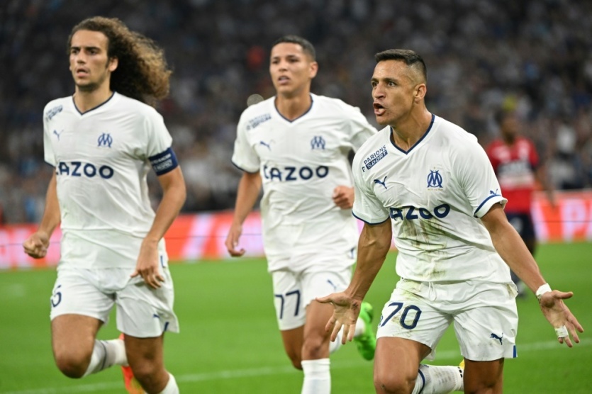 Les Marseillais Alexis Sanchez (d), Amine Harit (c) et Matteo Guendouzi après le but du premier contre Lille, le 10 septembre 2022 au Stade Vélodrome Christophe SIMON [AFP]