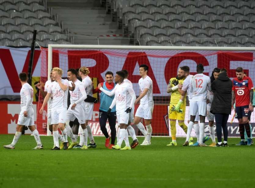 - | Crée le 22.03.2021 à 04h40 | Mis à jour le 22.03.2021 à 05h40ImprimerLa joie des Nîmois après leur victoire, 2-1 face à Lille, lors de leur match de L1, le 21 mars 2021 au stade Pierre Mauroy à Villeneuve d'Ascq FRANCOIS LO PRESTI [AFP]Lille passe au travers: surpris par le mal-classé Nîmes (2-1), le leader de la Ligue 1 a raté l'occasion de prendre le large dimanche avant le choc de ses poursuivants Lyon-Paris SG, alors que Lens, vainqueur à Strasbourg (2-1), continue à rêver d'Europe.