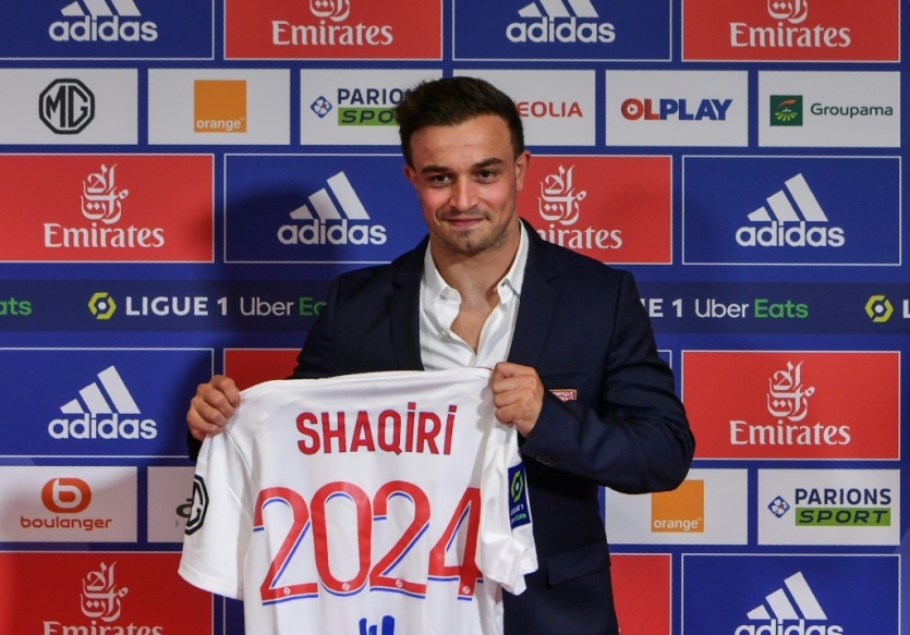 Le milieu de terrain suisse Xherdan Shaqiri, recrue de Lyon, lors de sa présentation officielle, le 25 août 2021 au Groupama Stadium à Décines-Charpieu PHILIPPE DESMAZES [AFP]