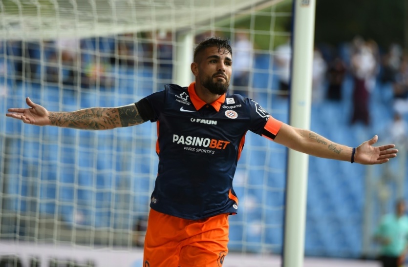 La joie de l'attaquant algérien de montpellier, Andy Delort, buteur à domicile contre Angers, lors du match de Ligue 1, le 20 septembre 2020 au Stade de La Mosson Sylvain THOMAS [AFP/Archives]MERCI DE VOUS IDENTIFIER