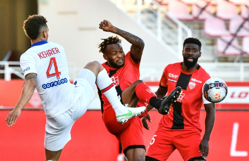 Le milieu gabonais de Dijon, Didier Ndong (c), aux prises avec le défenseur du Paris-SG, Thilo Kehrer, lors du match de Ligue 1 à Dijon, le 27 février 2021 Philippe DESMAZES [AFP]