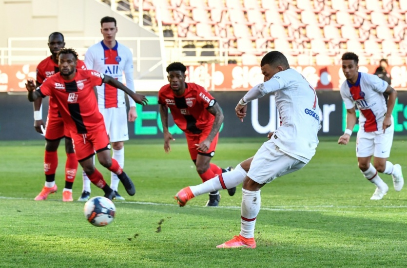 L'attaquant du Paris-SG, Kylian Mbappé, transforme son penalty lors du match de Ligue 1 à Dijon, le 27 février 2021 Philippe DESMAZES [AFP]MERCI DE VOUS IDENTIFIER