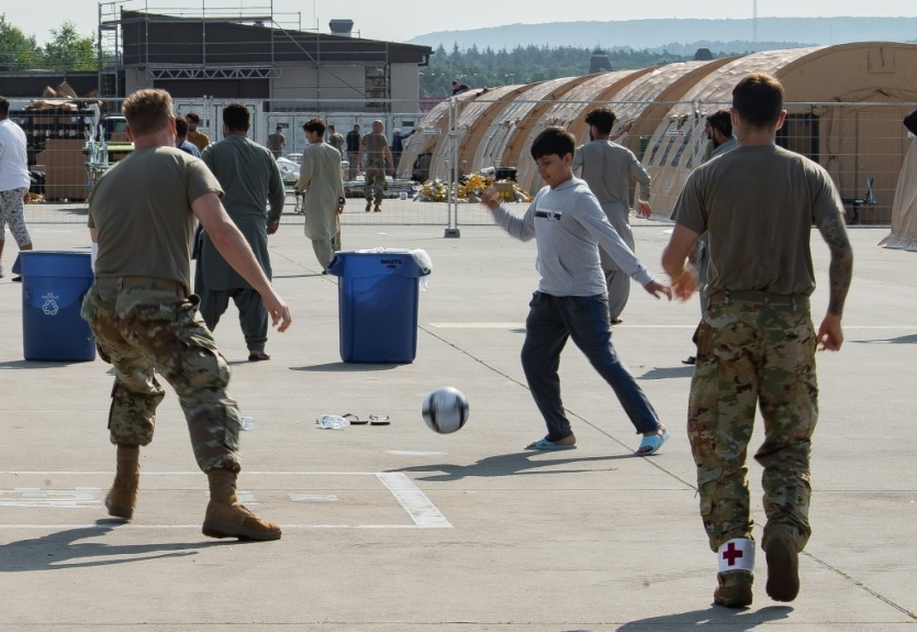 Des enfants afghans jouent au foot avec des soldats américains, sur la base aérienne américaine de Ramstein, en Allemagne, le 26 août 2021. Photo distribué par le service de relations publique de l'armée américaine Edgar Grimaldo [US Central Command Public Affairs/AFP]