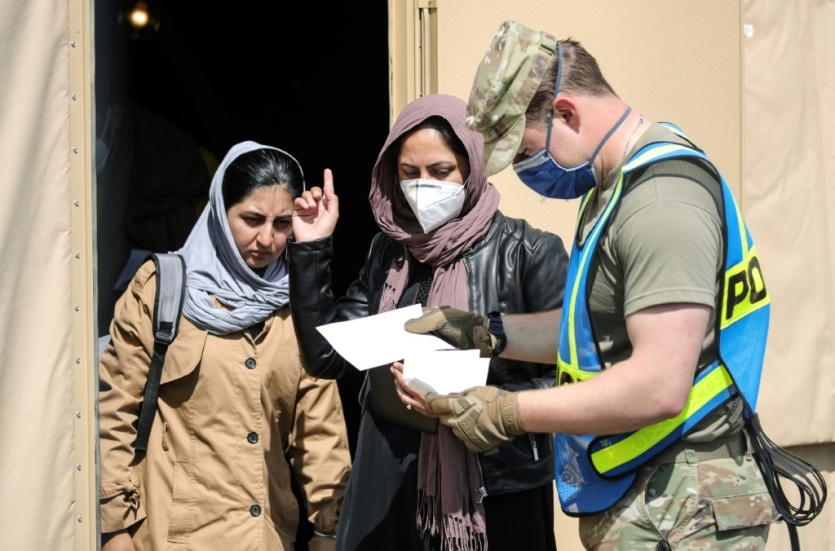 Un soldat américain parle avec des réfugiées afghanes arrivant sur la base aérienne américaine de Ramstein, en Allemagne, le 26 août 2021 Armando BABANI [AFP]