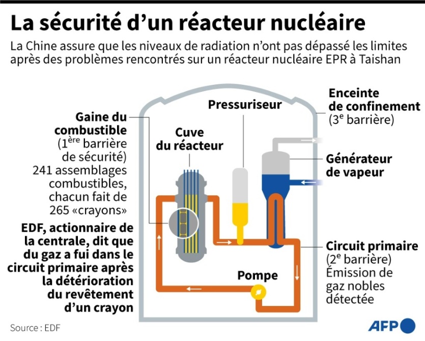 La chaîne de télévision américaine CNN a rapporté lundi une possible "fuite" dans cette centrale située dans le sud de la Chine, qui dispose des seuls réacteurs EPR à être entrés en service dans le monde.