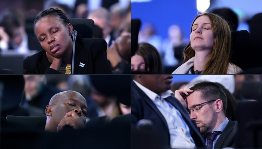Combo de délégués somnolant à la dernière session de la COP27 à Charm el-Cheikh en Egypte, terminée à l'aube, le 20 novembre 2022 JOSEPH EID [AFP]