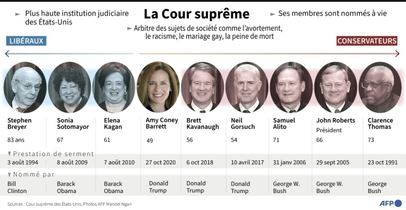 "Si les gens pensent que tout est politique, comment la Cour pourrait-elle survivre ?", a renchéri sa consœur Sonia Sotomayor, alors que la gauche américaine pousse déjà pour réformer l'influente institution après l'arrivée de trois juges choisis par Donald Trump.