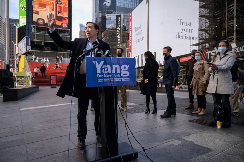 L'un des principaux candidats à la mairie de New York, Andrew Yang, donne une conférence de presse à Times Square le 9 mai 2021, après une fusillade qui a fait trois blessées sur ce haut lieu du tourisme new-yorkais Ed JONES [AFP]