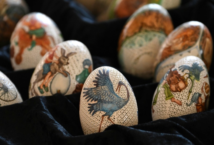 Mais les œufs de l'oie, selon elle, restent "les plus appropriés, car ils ont une large surface, une coquille solide et sont blancs, ce qui est important pour la coloration et le dessin des détails miniatures".