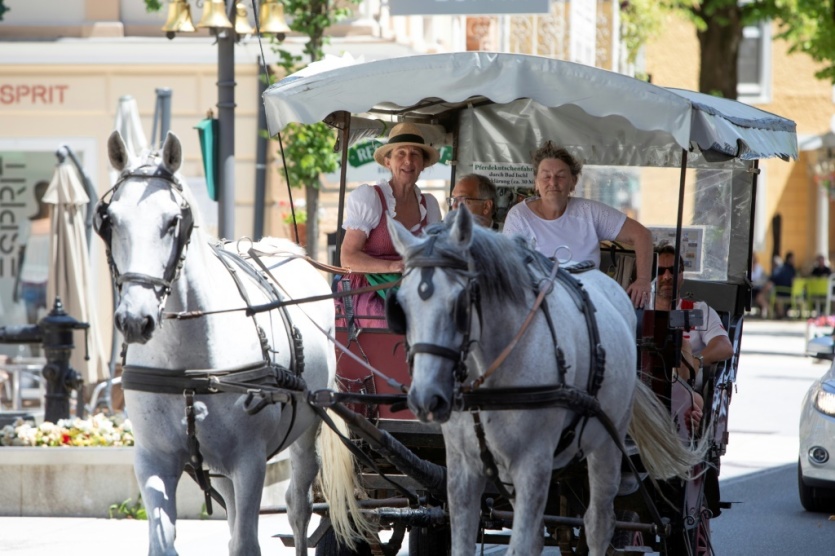 Une femme portant une robe traditionnelle "dirndl" est assise dans une voiture à cheval à Bad Ischl (Autriche) le 24 juin 2021 ALEX HALADA [AFP]