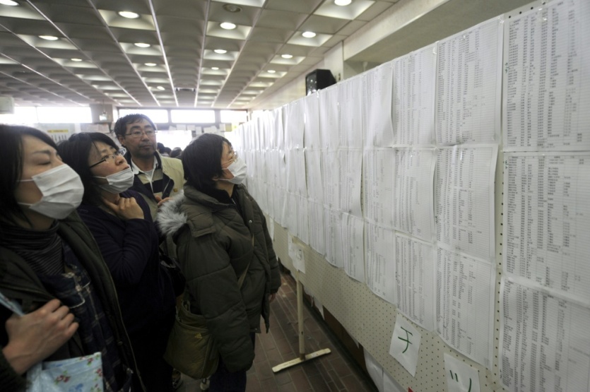 Des listes de survivants sont affichées dans un refuge de Natori, le 14 mars 2011, dans le nord-est du Japon, trois jours après le séisme et le tsunami Mike CLARKE [AFP/Archives]MERCI DE VOUS IDENTIFIER