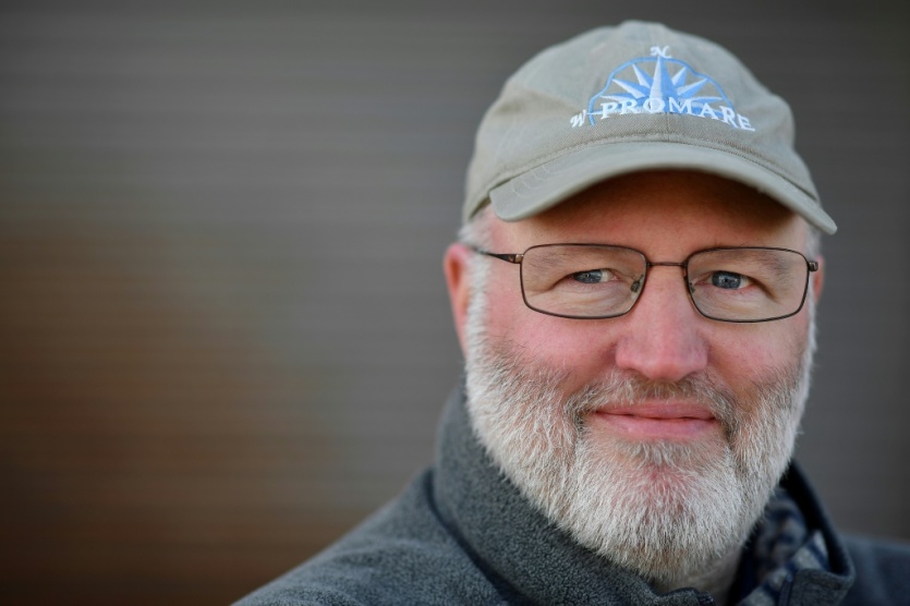 Brett Phaneuf à l'origine du projet de navire autonome le Mayflower 400, pose le 27 avril 2021 au port de Plymouth BEN STANSALL [AFP]
