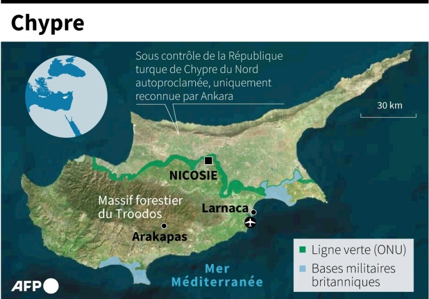 Carte de Chypre localisant Arakapas et le massif forestier du Troodos [AFP]