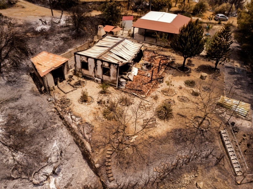 Une photo de drone prise le 4 juillet 2021 montre une maison détruite par les flammes dans le village d'Ora sur les montagnes du Troodos à Chypre Iakovos HATZISTAVROU [AFP]