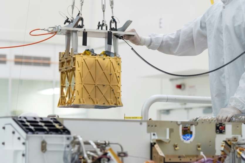 Le "Mars Oxygen In-Situ Resource Utilization Experiment" (Moxie) est une boîte dorée de la taille d'une batterie de voiture, située à l'avant droit du rover.