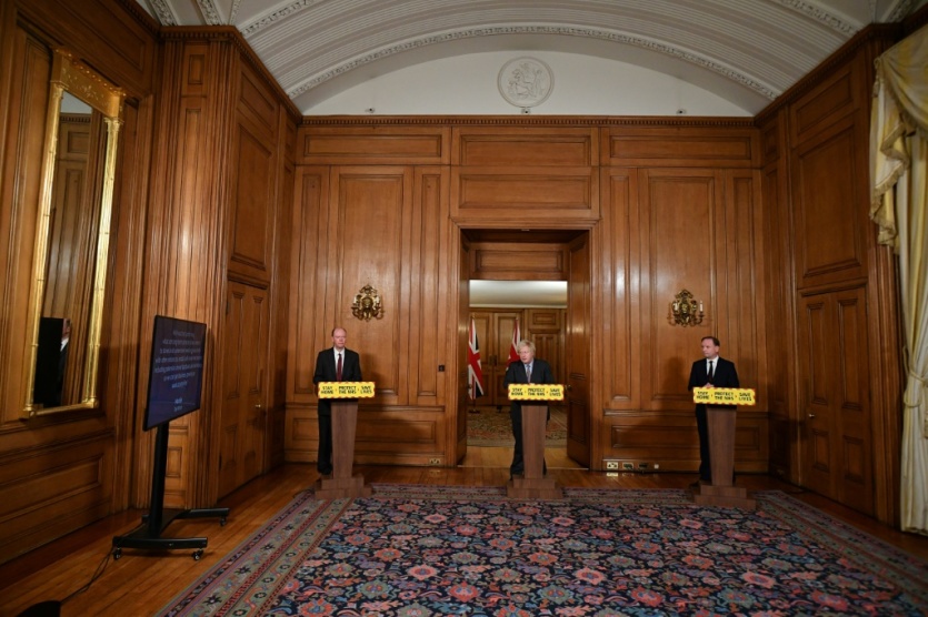 Boris Johnson (c) flanqué du patron du système de santé publique (NHS), Simon Stevens (d), et du médecin chef pour l'Angleterre, Chris Whitty (g), en conférence de presse, le 26 janvier 2021 à Londres JUSTIN TALLIS [POOL/AFP]MERCI DE VOUS IDENTIFIER