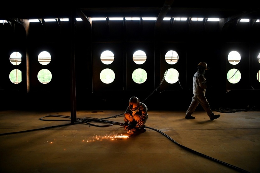 Un ouvrier effectue une soudure, sur le chantier d'une réplique du Titanic, le 27 avril 2021, dans le district de Daying (Chine) NOEL CELIS [AFP]
