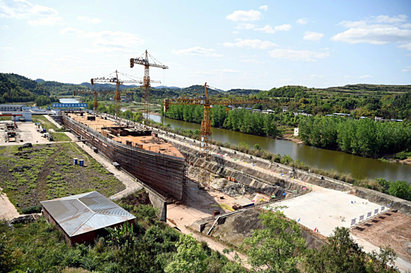 A Suining (sud-ouest), quatre grues surplombent une immense cale sèche au bord d'une rivière. Casques de protection jaunes sur la tête, des ouvriers s'activent autour de la coque d'un navire géant.