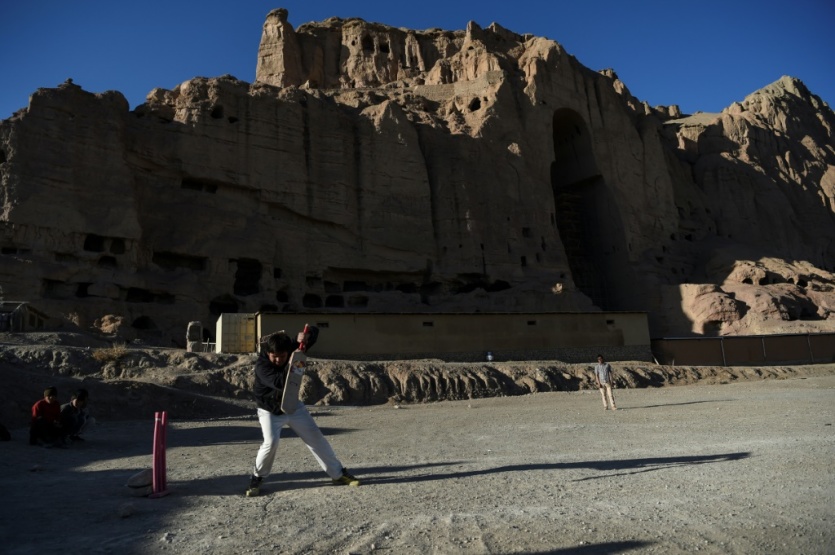 De jeunes Hazaras jouent au cricket près du site où se dressaient les statues de Bouddha géantes détruites par les talibans en 2001, dans la vallée de Bamiyan en Afghanistan le 4 mars 2021 WAKIL KOHSAR [AFP]