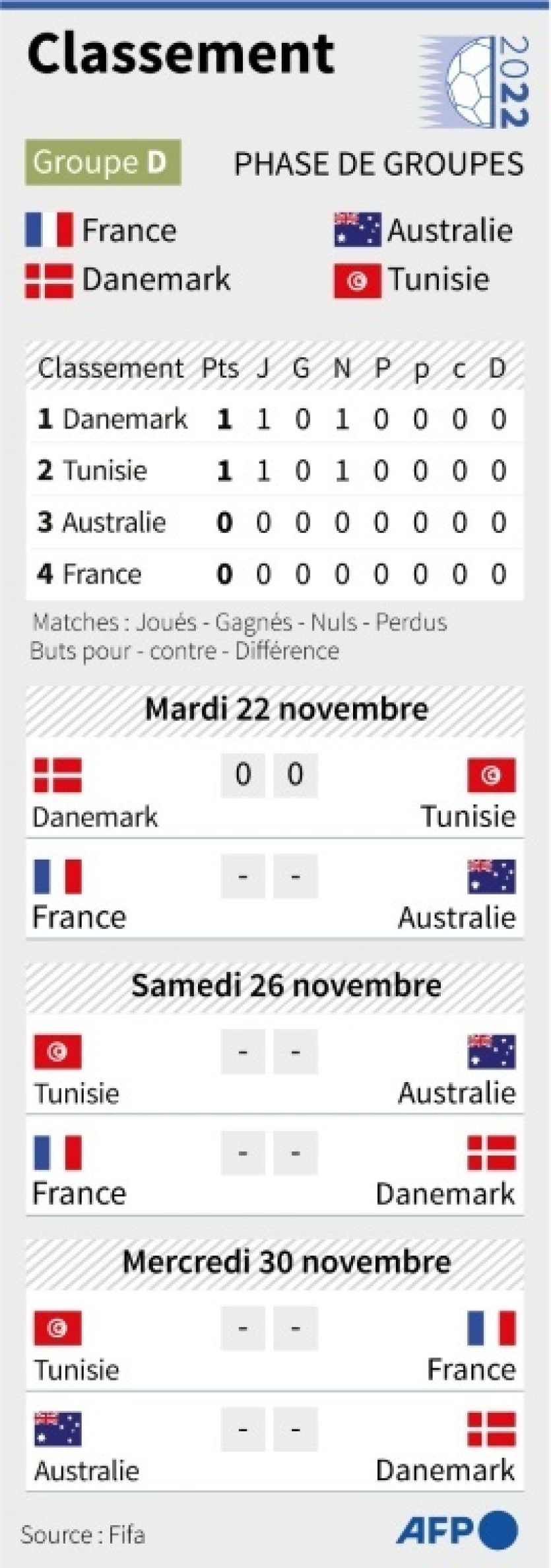 Coupe du monde 2022 : Classement groupe D [AFP]MERCI DE VOUS IDENTIFIER