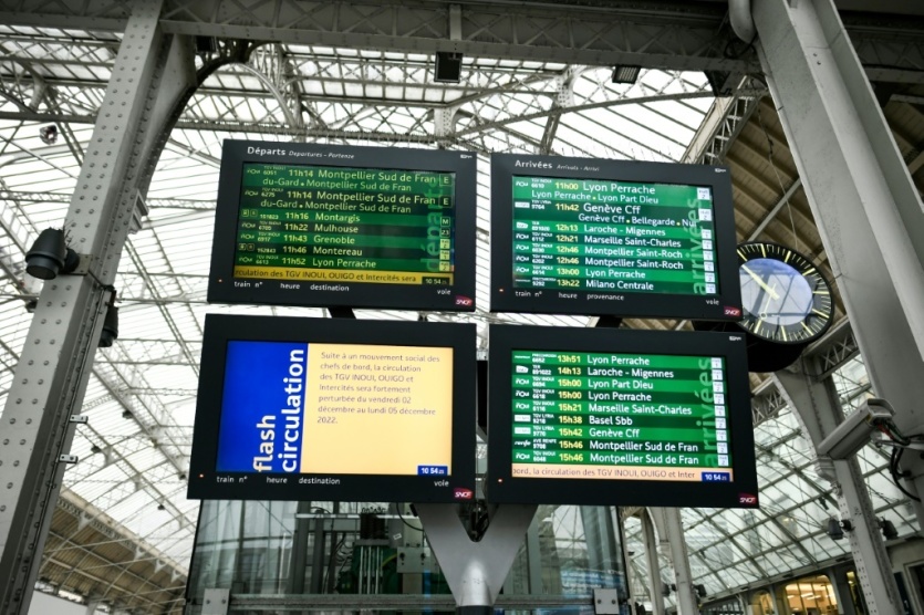 Un panneau informe les voyageurs d'un mouvement social des chefs de bord, le 2 décembre 2022 à la Gare de Lyon, à Paris STEPHANE DE SAKUTIN [AFP]