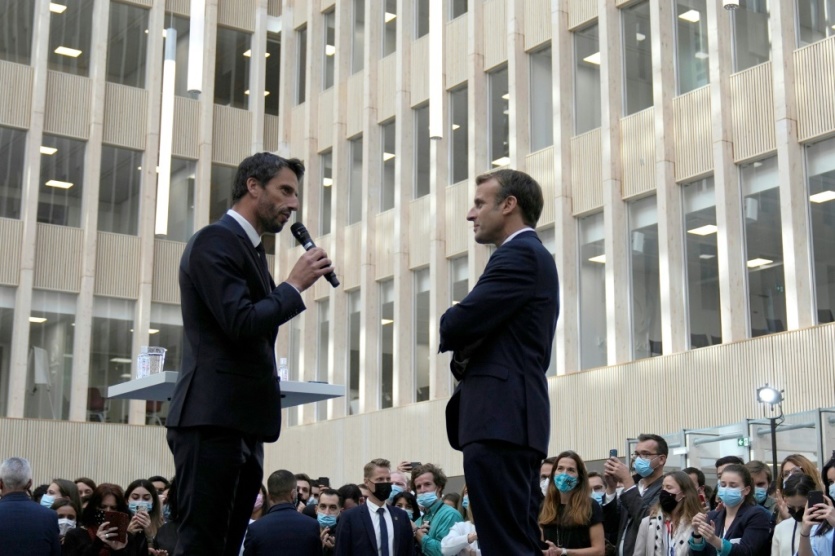 Le président Emmanuel Macron et le patron de l'organisation de Paris-2024 Tony Estanguet s'adressent aux membres du staff des Jeux parisiens à Saint-Denis, outside Paris, le 14 octobre 2021 Francois Mori [POOL/AFP/Archives]