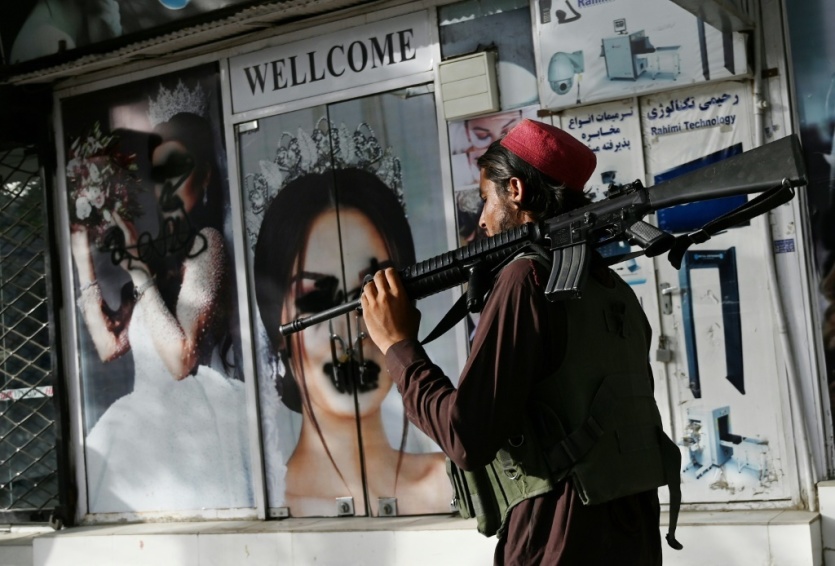 Un taliban armé passe devant un salon de beauté fermé dont les affiches de visages de femmes ont été recouvertes de peinture noire, le 18 août 2021 à Kaboul Wakil KOHSAR [AFP]MERCI DE VOUS IDENTIFIER