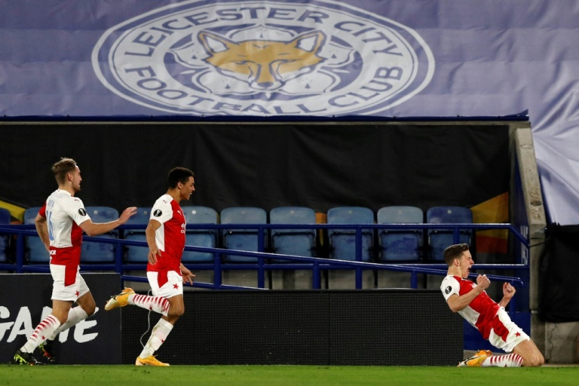 La joie du milieu de terrain du Slavia Prague, Lukas Provod, après avoir ouvert le score contre Leicester, lors de leur 16e de finale retour de la Ligue Europa, le 25 février 2021 à Leicester Adrian DENNIS [AFP]